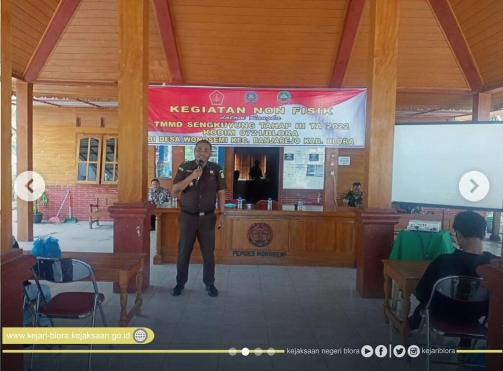 Pada hari Kamis tanggal 13 Oktober 2022 pukul 09.00 wib s/d selesai di Balai Desa Wonosemi, Kec. Banjarejo, Kab. Blora Kepala Kejaksaan Negeri Blora yang diwakili oleh Kasi Datun Kejari Blora ( Agustinus Dian Leo Putra, SH ) menghadiri dan memberikan Materi Perdata dalam Kegiatan Non Fisik TMMD Sengkuyung Tahap III TA 2022 Kodim 0721/Blora di Ds. Wonosemi, Kec. Banjarejo, Kab. Blora yang dihadiri kurang lebih 50 orang.