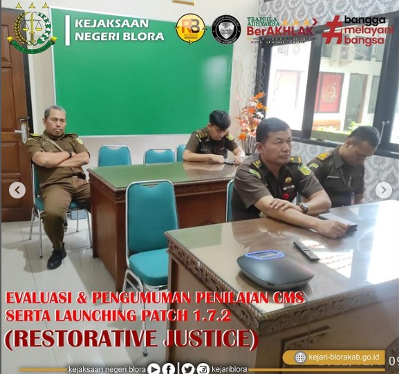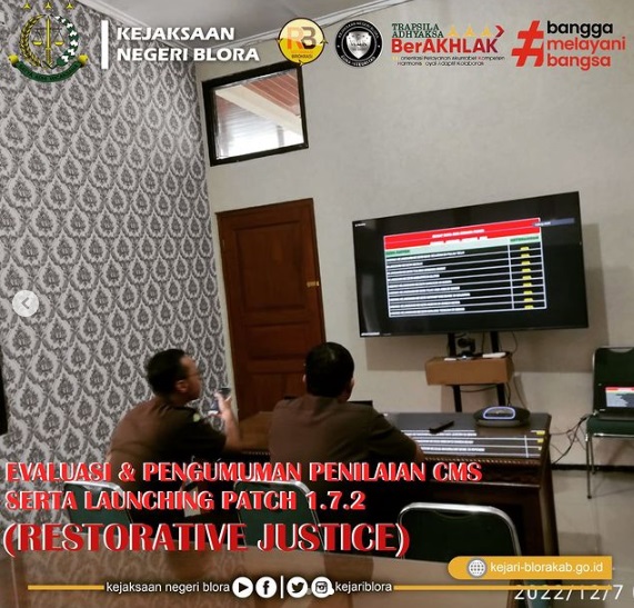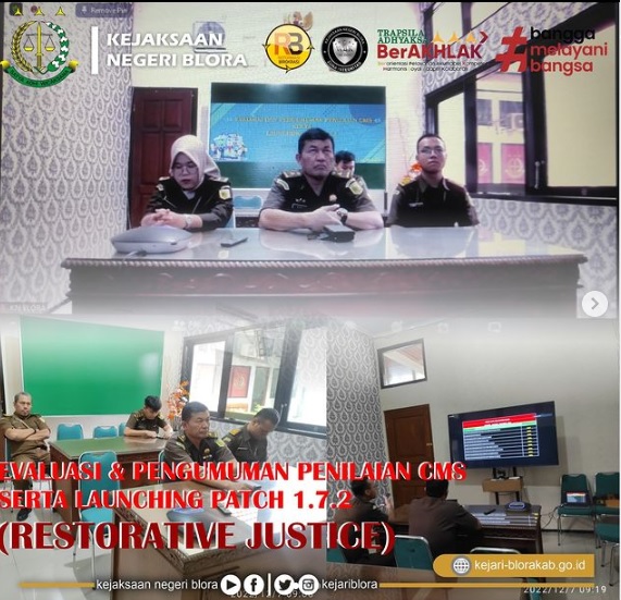 Pada hari Rabu tanggal 07 Desember 2022 pukul 08.30 sampai dengan selesai dilaksanakan Evaluasi dan Pengumuman Penilaian CMS serta launching Patch 1.7.2 (Menu Resorative Justice) yang diikuti oleh Bidang Pidana Umum Kejaksaan Negeri Blora;