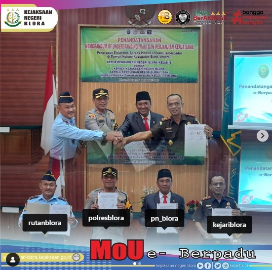 Uncategorized Penandatanganan Perjanjian Kerjasama ( MoU ) e-Berpadu di daerah Hukum Kabupaten Blora admin December 27, 2022 1 min read Lihat postingan ini di Instagram Sebuah kiriman dibagikan oleh Kejaksaan Negeri Blora (@kejariblora) Continue Reading Previous Previous post: Apel Pagi di Kejaksaan Negeri BloraNext Next post: Kunjungan Kerja Jaksa Agung Republik Indonesia secara virtual Leave a Reply Cancel replyYour email address will not be published. Required fields are marked *Comment * Name * Email * Website Save my name, email, and website in this browser for the next time I comment. Related News Penandatanganan Perjanjian Kerja Sama (MoU) dan Sosialisasi Bidang Perdata dan Tata Usaha Negara antara PT Blora Patragas Hulu (Perseroda) dengan Kejaksaan Negeri Blora Penandatanganan Perjanjian Kerja Sama (MoU) dan Sosialisasi Bidang Perdata dan Tata Usaha Negara antara PT Blora Patragas Hulu (Perseroda) dengan Kejaksaan Negeri Blora April 17, 2026 JAKSA MASUK SEKOLAH SMP N 1 JIKEN JAKSA MASUK SEKOLAH SMP N 1 JIKEN April 17, 2026