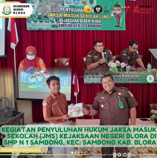 Uncategorized Penyuluhan Hukum Jaksa Masuk Sekolah (JMS) Kejaksaan Negeri Blora di aula SMP N 1 Sambong admin February 9, 2023 1 min read Lihat postingan ini di Instagram Sebuah kiriman dibagikan oleh Kejaksaan Negeri Blora (@kejariblora) Continue Reading Previous Previous post: Jaksa Agung RI ST Burhanuddin , mengucapkan Selamat Hari Pers Nasional 9 Februari 2023, dengan tema Pers Bebas Demokrasi Bermartabat , satukan langkah membangun negeri mewujudkan Indonesia MajuNext Next post: Penyuluhan Hukum Jaksa Masuk Sekolah (JMS) Kejaksaan Negeri Blora di aula SMP N 2 Cepu Kec. Cepu Kab. Blora Leave a Reply Cancel replyYour email address will not be published. Required fields are marked *Comment * Name * Email * Website Save my name, email, and website in this browser for the next time I comment. Related News Penerangan Hukum kepada Kelompok Kerja Madrasah Aliyah dan Madrasah Tsanawiyah pada Kemenag Kab. Blora Penerangan Hukum kepada Kelompok Kerja Madrasah Aliyah dan Madrasah Tsanawiyah pada Kemenag Kab. Blora April 23, 2026 Kegiatan Roadshow Wakil Menteri Kesehatan terkait Active Case Finding (ACF) Tuberkulosis (TB) serta kegiatan Tracing TB yang terintegrasi dengan Cek Kesehatan Gratis (CKG) Kegiatan Roadshow Wakil Menteri Kesehatan terkait Active Case Finding (ACF) Tuberkulosis (TB) serta kegiatan Tracing TB yang terintegrasi dengan Cek Kesehatan Gratis (CKG) April 23, 2026