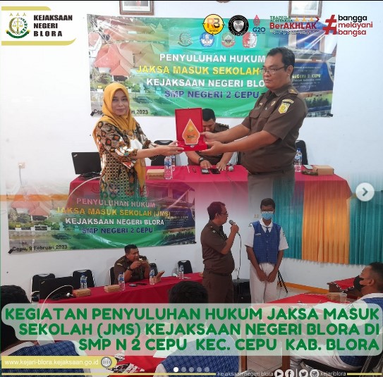 Uncategorized Penyuluhan Hukum Jaksa Masuk Sekolah (JMS) Kejaksaan Negeri Blora di aula SMP N 2 Cepu Kec. Cepu Kab. Blora admin February 9, 2023 1 min read Lihat postingan ini di Instagram Sebuah kiriman dibagikan oleh Kejaksaan Negeri Blora (@kejariblora) Continue Reading Previous Previous post: Penyuluhan Hukum Jaksa Masuk Sekolah (JMS) Kejaksaan Negeri Blora di aula SMP N 1 SambongNext Next post: Penyuluhan Hukum Program Jaksa Menjawab Kejaksaan Negeri Blora di Lapangan Kridosono Leave a Reply Cancel replyYour email address will not be published. Required fields are marked *Comment * Name * Email * Website Save my name, email, and website in this browser for the next time I comment. Related News Penerangan Hukum kepada Kelompok Kerja Madrasah Aliyah dan Madrasah Tsanawiyah pada Kemenag Kab. Blora Penerangan Hukum kepada Kelompok Kerja Madrasah Aliyah dan Madrasah Tsanawiyah pada Kemenag Kab. Blora April 23, 2026 Kegiatan Roadshow Wakil Menteri Kesehatan terkait Active Case Finding (ACF) Tuberkulosis (TB) serta kegiatan Tracing TB yang terintegrasi dengan Cek Kesehatan Gratis (CKG) Kegiatan Roadshow Wakil Menteri Kesehatan terkait Active Case Finding (ACF) Tuberkulosis (TB) serta kegiatan Tracing TB yang terintegrasi dengan Cek Kesehatan Gratis (CKG) April 23, 2026