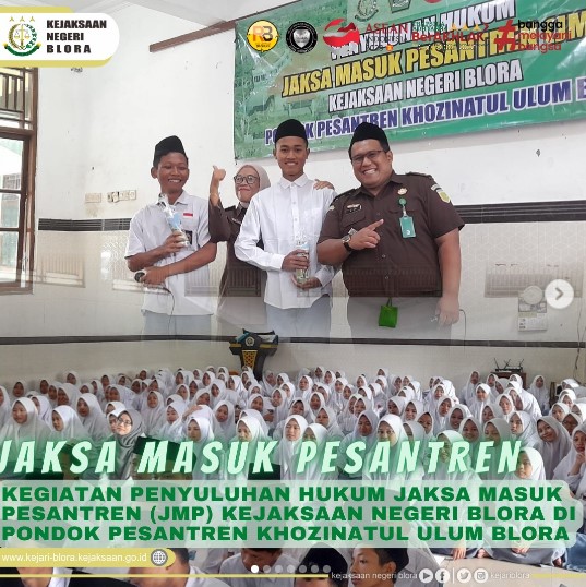 Uncategorized Penyuluhan Hukum Jaksa Masuk Pesantren (JMP) Kejaksaan Negeri Blora di aula Pondok Pesantren Khozinatul Ulum Blora admin February 28, 2023 1 min read Lihat postingan ini di Instagram Sebuah kiriman dibagikan oleh Kejaksaan Negeri Blora (@kejariblora) Continue Reading Previous Previous post: Penerangan Hukum Program Jaksa Jaga Desa Kejaksaan Negeri Blora di Aula Kecamatan JatiNext Next post: Kepala Kejaksaan Negeri Blora beserta Staff dan Jajaran mengucapkan Selamat kepada Bupati dan Pemerintahan Kabupaten Blora atas Peraihan Penghargaan Adipura 2022. Leave a Reply Cancel replyYour email address will not be published. Required fields are marked *Comment * Name * Email * Website Save my name, email, and website in this browser for the next time I comment. Related News Penerangan Hukum kepada Kelompok Kerja Madrasah Aliyah dan Madrasah Tsanawiyah pada Kemenag Kab. Blora Penerangan Hukum kepada Kelompok Kerja Madrasah Aliyah dan Madrasah Tsanawiyah pada Kemenag Kab. Blora April 23, 2026 Kegiatan Roadshow Wakil Menteri Kesehatan terkait Active Case Finding (ACF) Tuberkulosis (TB) serta kegiatan Tracing TB yang terintegrasi dengan Cek Kesehatan Gratis (CKG) Kegiatan Roadshow Wakil Menteri Kesehatan terkait Active Case Finding (ACF) Tuberkulosis (TB) serta kegiatan Tracing TB yang terintegrasi dengan Cek Kesehatan Gratis (CKG) April 23, 2026