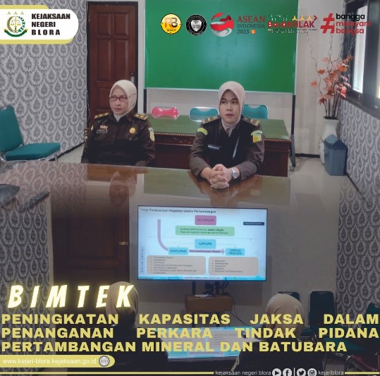 Uncategorized Bimbingan Teknis Peningkatan Kapasitas Jaksa Dalam Penanganan Perkara Tindak Pidana Pertambangan Mineral dan Batubara oleh Jaksa Agung Muda Bidang Tindak Pidana Umum secara daring admin March 6, 2023 1 min read Lihat postingan ini di Instagram Sebuah kiriman dibagikan oleh Kejaksaan Negeri Blora (@kejariblora) Continue Reading Previous Previous post: Presiden Joko Widodo juga menghimbau Kejaksaan untuk melakukan perbaikan dulu secara internal dan memastikan tidak ada satuannya yang memamerkan kemewahanNext Next post: Rapat Koordinasi dalam rangka Pengendalian Inflasi Tahun 2023 yang dipimpin oleh Menteri Dalam Negeri yang dilaksanakan secara online melalui zoom meeting Leave a Reply Cancel replyYour email address will not be published. Required fields are marked *Comment * Name * Email * Website Save my name, email, and website in this browser for the next time I comment. Related News Penerangan Hukum kepada Kelompok Kerja Madrasah Aliyah dan Madrasah Tsanawiyah pada Kemenag Kab. Blora Penerangan Hukum kepada Kelompok Kerja Madrasah Aliyah dan Madrasah Tsanawiyah pada Kemenag Kab. Blora April 23, 2026 Kegiatan Roadshow Wakil Menteri Kesehatan terkait Active Case Finding (ACF) Tuberkulosis (TB) serta kegiatan Tracing TB yang terintegrasi dengan Cek Kesehatan Gratis (CKG) Kegiatan Roadshow Wakil Menteri Kesehatan terkait Active Case Finding (ACF) Tuberkulosis (TB) serta kegiatan Tracing TB yang terintegrasi dengan Cek Kesehatan Gratis (CKG) April 23, 2026