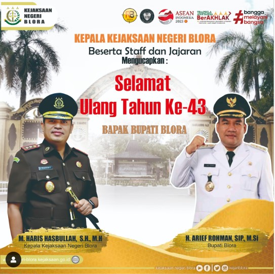 Uncategorized Kepala Kejaksaan Negeri Blora Beserta Staf Dan Seluruh Jajaran Mengucapkan : Selamat Ulang Tahun Ke 43 Bapak Bupati Blora H. Arief Rohman,SIP,M.SiKepala Kejaksaan Negeri Blora admin March 8, 2023 1 min read Lihat postingan ini di Instagram Sebuah kiriman dibagikan oleh Kejaksaan Negeri Blora (@kejariblora) Continue Reading Previous Previous post: Rapat Reformasi Birokrasi 2023 yang dipimpin langsung oleh Bapak M. Haris Hasbullah, S.H., M.H. selaku Kepala Kejaksaan Negeri Blora dan diikuti oleh Kepala Seksi dan Kepala Sub Bagian Pembinaan bertempat di Ruang Rapat Kepala Kejaksaan Negeri Blora,Next Next post: Kegiatan Sarasehan Badan Permusyawaratan Desa ( BPD ) Kabupaten Blora dengan Tema Optimalisasi Peran BPD dalam Regulasi dan Pengawasan Bumdes, Anggaran Desa serta Pencegahan Pelanggaran Administrasi/Tindak Pidana bertempat di Aula Bamboe Sanjaya yang beralamatkan di Jl. Blora – Randublatung Leave a Reply Cancel replyYour email address will not be published. Required fields are marked *Comment * Name * Email * Website Save my name, email, and website in this browser for the next time I comment. Related News Penerangan Hukum kepada Kelompok Kerja Madrasah Aliyah dan Madrasah Tsanawiyah pada Kemenag Kab. Blora Penerangan Hukum kepada Kelompok Kerja Madrasah Aliyah dan Madrasah Tsanawiyah pada Kemenag Kab. Blora April 23, 2026 Kegiatan Roadshow Wakil Menteri Kesehatan terkait Active Case Finding (ACF) Tuberkulosis (TB) serta kegiatan Tracing TB yang terintegrasi dengan Cek Kesehatan Gratis (CKG) Kegiatan Roadshow Wakil Menteri Kesehatan terkait Active Case Finding (ACF) Tuberkulosis (TB) serta kegiatan Tracing TB yang terintegrasi dengan Cek Kesehatan Gratis (CKG) April 23, 2026