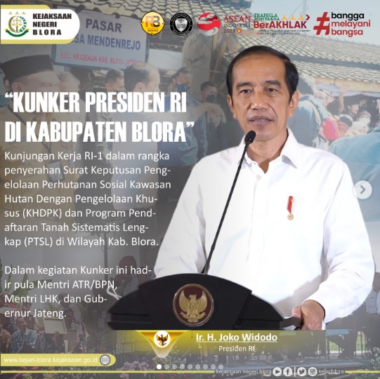 Uncategorized Kunjungan Kerja RI-1 dalam rangka penyerahan Surat Keputusan Pengelolaan Perhutanan Sosial Kawasan Hutan Dengan Pengelolaan Khusus (KHDPK) dan Program Pendaftaran Tanah Sistematis Lengkap (PTSL) di Wilayah Kab. Blora admin March 10, 2023 1 min read Lihat postingan ini di Instagram Sebuah kiriman dibagikan oleh Kejaksaan Negeri Blora (@kejariblora) Continue Reading Previous Previous post: Kegiatan Aksi Demo damai Solidaritas dari Paguyuban Bledek Liar dari BojonegoroNext Next post: Kegiatan Apel Kerja Kejari Blora Senin 13 Maret 2023 Leave a Reply Cancel replyYour email address will not be published. Required fields are marked *Comment * Name * Email * Website Save my name, email, and website in this browser for the next time I comment. Related News Penerangan Hukum kepada Kelompok Kerja Madrasah Aliyah dan Madrasah Tsanawiyah pada Kemenag Kab. Blora Penerangan Hukum kepada Kelompok Kerja Madrasah Aliyah dan Madrasah Tsanawiyah pada Kemenag Kab. Blora April 23, 2026 Kegiatan Roadshow Wakil Menteri Kesehatan terkait Active Case Finding (ACF) Tuberkulosis (TB) serta kegiatan Tracing TB yang terintegrasi dengan Cek Kesehatan Gratis (CKG) Kegiatan Roadshow Wakil Menteri Kesehatan terkait Active Case Finding (ACF) Tuberkulosis (TB) serta kegiatan Tracing TB yang terintegrasi dengan Cek Kesehatan Gratis (CKG) April 23, 2026