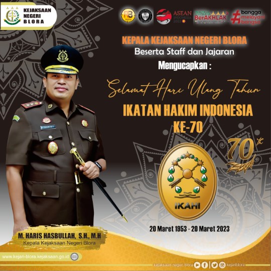 Uncategorized Kepala Kejaksaan Negeri Blora beserta jajaran mengucapkan Selamat Hari Ulang Tahun Ikatan Hakim Indonesia (IKAHI) Ke – 70th admin March 20, 2023 1 min read Lihat postingan ini di Instagram Sebuah kiriman dibagikan oleh Kejaksaan Negeri Blora (@kejariblora) Continue Reading Previous Previous post: Kegiatan Monitoring dan Update data penanganan perkara tindak pidana korupsi pada wilayah hukum Kejaksaan Tinggi Jawa Tengah Secara OnlineNext Next post: Kegiatan Apel Kerja Kejari Blora Yang Diikuti Oleh Seluruh Pegawai di Lingkungan Kejaksaan Leave a Reply Cancel replyYour email address will not be published. Required fields are marked *Comment * Name * Email * Website Save my name, email, and website in this browser for the next time I comment. Related News Penerangan Hukum kepada Kelompok Kerja Madrasah Aliyah dan Madrasah Tsanawiyah pada Kemenag Kab. Blora Penerangan Hukum kepada Kelompok Kerja Madrasah Aliyah dan Madrasah Tsanawiyah pada Kemenag Kab. Blora April 23, 2026 Kegiatan Roadshow Wakil Menteri Kesehatan terkait Active Case Finding (ACF) Tuberkulosis (TB) serta kegiatan Tracing TB yang terintegrasi dengan Cek Kesehatan Gratis (CKG) Kegiatan Roadshow Wakil Menteri Kesehatan terkait Active Case Finding (ACF) Tuberkulosis (TB) serta kegiatan Tracing TB yang terintegrasi dengan Cek Kesehatan Gratis (CKG) April 23, 2026