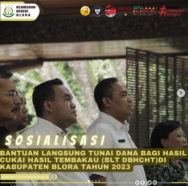 Uncategorized Kegiatan Sosialisasi Bantuan Langsung Tunai Dana Bagi Hasil Cukai Hasil Tembakau (BLT DBHCHT) di Kabupaten Blora tahun 2023 admin March 21, 2023 1 min read Lihat postingan ini di Instagram Sebuah kiriman dibagikan oleh Kejaksaan Negeri Blora (@kejariblora) Continue Reading Previous Previous post: Pengundian Penempatan Pedagangan Blok Y Pasar Rakyat NgawenNext Next post: Kepala Kejaksaan Negeri Blora beserta Staf dan Jajaran,Mengucapkan :”Selamat Hari Raya Nyepi tahun 2023 Saka 1945″ Rahajeng Rahina Nyepi. Leave a Reply Cancel replyYour email address will not be published. Required fields are marked *Comment * Name * Email * Website Save my name, email, and website in this browser for the next time I comment. Related News Penerangan Hukum kepada Kelompok Kerja Madrasah Aliyah dan Madrasah Tsanawiyah pada Kemenag Kab. Blora Penerangan Hukum kepada Kelompok Kerja Madrasah Aliyah dan Madrasah Tsanawiyah pada Kemenag Kab. Blora April 23, 2026 Kegiatan Roadshow Wakil Menteri Kesehatan terkait Active Case Finding (ACF) Tuberkulosis (TB) serta kegiatan Tracing TB yang terintegrasi dengan Cek Kesehatan Gratis (CKG) Kegiatan Roadshow Wakil Menteri Kesehatan terkait Active Case Finding (ACF) Tuberkulosis (TB) serta kegiatan Tracing TB yang terintegrasi dengan Cek Kesehatan Gratis (CKG) April 23, 2026