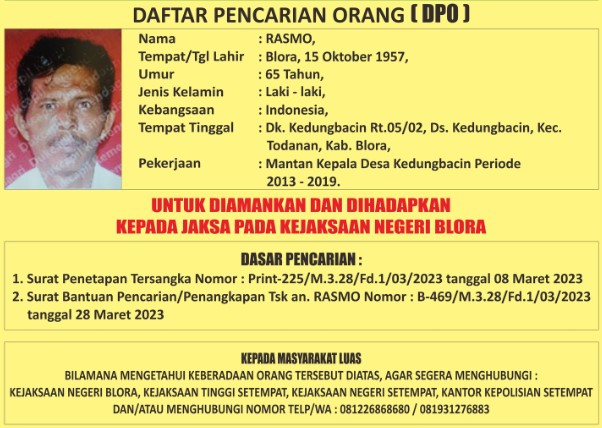 Uncategorized DAFTAR PENCARIAN ORANG ( DPO )Kejaksaan Negeri Blora, admin March 31, 2023 1 min read Lihat postingan ini di Instagram Sebuah kiriman dibagikan oleh Kejaksaan Negeri Blora (@kejariblora) Continue Reading Previous Previous post: Kegiatan Berbagi Takjil Gratis Bersama Ikatan Adhyaksa Dharmakarini Daerah BloraNext Next post: Bakti Sosial Kejaksaan Negeri Blora dan IAD Daerah Blora Leave a Reply Cancel replyYour email address will not be published. Required fields are marked *Comment * Name * Email * Website Save my name, email, and website in this browser for the next time I comment. Related News Penerangan Hukum kepada Kelompok Kerja Madrasah Aliyah dan Madrasah Tsanawiyah pada Kemenag Kab. Blora Penerangan Hukum kepada Kelompok Kerja Madrasah Aliyah dan Madrasah Tsanawiyah pada Kemenag Kab. Blora April 23, 2026 Kegiatan Roadshow Wakil Menteri Kesehatan terkait Active Case Finding (ACF) Tuberkulosis (TB) serta kegiatan Tracing TB yang terintegrasi dengan Cek Kesehatan Gratis (CKG) Kegiatan Roadshow Wakil Menteri Kesehatan terkait Active Case Finding (ACF) Tuberkulosis (TB) serta kegiatan Tracing TB yang terintegrasi dengan Cek Kesehatan Gratis (CKG) April 23, 2026