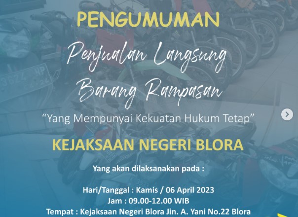 Uncategorized PENGUMUMANPenjualan Langsung Barang rampasanYang Mempunyai Kekuatan Hukum TetapKejaksaan Negeri Blora admin April 5, 2023 1 min read Lihat postingan ini di Instagram Sebuah kiriman dibagikan oleh Kejaksaan Negeri Blora (@kejariblora) Continue Reading Previous Previous post: Kejaksaan Negeri Blora melalui Tim Penyidik Bidang Tindak Pidana Khusus memeriksa 2 orang saksi yang terkait dengan perkara Dugaan Jual Beli Kios Pasar Randublatung Kec. Randublatung Kab. Blora Periode Tahun Anggaran 2018Next Next post: Kepada Seluruh Masyarakat Kabupaten Blora, Agar selalu Waspada Terhadap Modus Penipuian yang Mengatas Namakan Pejabat / Pegawai pada Kejaksaan Negeri Blora. Leave a Reply Cancel replyYour email address will not be published. Required fields are marked *Comment * Name * Email * Website Save my name, email, and website in this browser for the next time I comment. Related News Penerangan Hukum kepada Kelompok Kerja Madrasah Aliyah dan Madrasah Tsanawiyah pada Kemenag Kab. Blora Penerangan Hukum kepada Kelompok Kerja Madrasah Aliyah dan Madrasah Tsanawiyah pada Kemenag Kab. Blora April 23, 2026 Kegiatan Roadshow Wakil Menteri Kesehatan terkait Active Case Finding (ACF) Tuberkulosis (TB) serta kegiatan Tracing TB yang terintegrasi dengan Cek Kesehatan Gratis (CKG) Kegiatan Roadshow Wakil Menteri Kesehatan terkait Active Case Finding (ACF) Tuberkulosis (TB) serta kegiatan Tracing TB yang terintegrasi dengan Cek Kesehatan Gratis (CKG) April 23, 2026