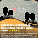 Uncategorized Tim Penyidik Bidang Tindak Pidana Khusus memeriksa 1 orang saksi yang terkait dengan perkara Dugaan Jual Beli Kios Pasar Randublatung Kec. Randublatung Kab. Blora Periode Tahun Anggaran 2018 admin April 27, 2023 1 min read Lihat postingan ini di Instagram Sebuah kiriman dibagikan oleh Kejaksaan Negeri Blora (@kejariblora) Continue Reading Previous Previous post: Kegiatan Permintaan Keterangan Penyidikan tentang Dugaan penyimpangan dalam pengelolaan Dana Desa (DD) Desa Kedungbacin Kecamatan Todanan Kab. Blora Tahun Anggaran 2018 s/d 2019Next Next post: Kegiatan Video Conference bersama Kejaksaan Agung RI Bidang Pembinaan dengan Agenda : Pelaksanaan Indeks Kualitas Pelayanan Publik, Pelaksanaan Indikator Pelayanan Publik Kaum Rentan Leave a Reply Cancel replyYour email address will not be published. Required fields are marked *Comment * Name * Email * Website Save my name, email, and website in this browser for the next time I comment. Related News Penerangan Hukum kepada Kelompok Kerja Madrasah Aliyah dan Madrasah Tsanawiyah pada Kemenag Kab. Blora Penerangan Hukum kepada Kelompok Kerja Madrasah Aliyah dan Madrasah Tsanawiyah pada Kemenag Kab. Blora April 23, 2026 Kegiatan Roadshow Wakil Menteri Kesehatan terkait Active Case Finding (ACF) Tuberkulosis (TB) serta kegiatan Tracing TB yang terintegrasi dengan Cek Kesehatan Gratis (CKG) Kegiatan Roadshow Wakil Menteri Kesehatan terkait Active Case Finding (ACF) Tuberkulosis (TB) serta kegiatan Tracing TB yang terintegrasi dengan Cek Kesehatan Gratis (CKG) April 23, 2026