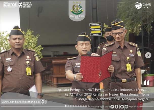 Uncategorized Upacara Peringatan HUT Persatuan Jaksa Indonesia (Persaja) ke 72 Tahun 2023 Kejaksaan Negeri Blora dengan Tema “Sinergi dan Kolaborasi untuk Kemajuan Negeri” admin May 8, 2023 1 min read Lihat postingan ini di Instagram Sebuah kiriman dibagikan oleh Kejaksaan Negeri Blora (@kejariblora) Continue Reading Previous Previous post: Kepala Kejaksaan Negeri Blora beserta seluruh Jajaran mengucapkan DIRGAHAYU PERSAJA KE 72 TAHUN 6 Mei 1951 – 6 Mei 2023 ” SINERGI DAN KOLABORASI UNTUK KEMAJUAN NEGERI “Next Next post: Memeringati HUT PERSAJA ke-72 tahun 2023 Kepala Kejaksaan Negeri Blora Beserta Ketua PERSAJA Kabupaten Blora melaksanakan kegiatan Bakti Sosial di Pondok Pesantren Khozinatul Ulum Blora, Leave a Reply Cancel replyYour email address will not be published. Required fields are marked *Comment * Name * Email * Website Save my name, email, and website in this browser for the next time I comment. Related News Penerangan Hukum kepada Kelompok Kerja Madrasah Aliyah dan Madrasah Tsanawiyah pada Kemenag Kab. Blora Penerangan Hukum kepada Kelompok Kerja Madrasah Aliyah dan Madrasah Tsanawiyah pada Kemenag Kab. Blora April 23, 2026 Kegiatan Roadshow Wakil Menteri Kesehatan terkait Active Case Finding (ACF) Tuberkulosis (TB) serta kegiatan Tracing TB yang terintegrasi dengan Cek Kesehatan Gratis (CKG) Kegiatan Roadshow Wakil Menteri Kesehatan terkait Active Case Finding (ACF) Tuberkulosis (TB) serta kegiatan Tracing TB yang terintegrasi dengan Cek Kesehatan Gratis (CKG) April 23, 2026