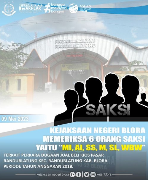 Uncategorized Kejaksaan Negeri Blora melalui Tim Penyidik Bidang Tindak Pidana Khusus memeriksa 6 orang saksi yang terkait dengan perkara Dugaan Jual Beli Kios Pasar Randublatung Kec. Randublatung Kab. Blora Periode Tahun Anggaran 2018 admin May 9, 2023 1 min read Lihat postingan ini di Instagram Sebuah kiriman dibagikan oleh Kejaksaan Negeri Blora (@kejariblora) Continue Reading Previous Previous post: Kegiatan Tahap II (PenyerahanTersangka dan Barang Bukti) Perkara Tindak Pidana Pembunuhan diHotel K Blora kepada Jaksa Penuntut Umum pada Kejaksaan Negeri Blora,Next Next post: Kegiatan Permintaan Keterangan Penyidikan tentang Dugaan penyimpangan dalam pengelolaan Dana Desa (DD) Desa Kedungbacin Kecamatan Todanan Kab. Blora Tahun Anggaran 2018 s/d 2019 Leave a Reply Cancel replyYour email address will not be published. Required fields are marked *Comment * Name * Email * Website Save my name, email, and website in this browser for the next time I comment. Related News Penerangan Hukum kepada Kelompok Kerja Madrasah Aliyah dan Madrasah Tsanawiyah pada Kemenag Kab. Blora Penerangan Hukum kepada Kelompok Kerja Madrasah Aliyah dan Madrasah Tsanawiyah pada Kemenag Kab. Blora April 23, 2026 Kegiatan Roadshow Wakil Menteri Kesehatan terkait Active Case Finding (ACF) Tuberkulosis (TB) serta kegiatan Tracing TB yang terintegrasi dengan Cek Kesehatan Gratis (CKG) Kegiatan Roadshow Wakil Menteri Kesehatan terkait Active Case Finding (ACF) Tuberkulosis (TB) serta kegiatan Tracing TB yang terintegrasi dengan Cek Kesehatan Gratis (CKG) April 23, 2026