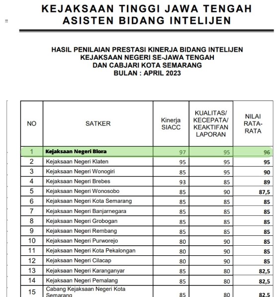Uncategorized Kejaksaan Negeri Blora raih Peringkat 1 Se-Jawa Tengah dalam Bidang Intelijen. admin May 11, 2023 1 min read Selamat atas pencapaian bidang Intelijen di Aplikasi SIACC, semoga tetap bisa mempertahankan Lihat postingan ini di Instagram Sebuah kiriman dibagikan oleh Kejaksaan Negeri Blora (@kejariblora) Continue Reading Previous Previous post: Kegiatan Permintaan Keterangan Penyidikan tentang Dugaan penyimpangan dalam pengelolaan Dana Desa (DD) Desa Kedungbacin Kecamatan Todanan Kab. Blora Tahun Anggaran 2018 s/d 2019Next Next post: Kegiatan Tahap II (Penyerahan Tersangka dan Barang Bukti) Perkara Tindak Pidana Narkotika kepada Jaksa Penuntut Umum pada Kejaksaan Negeri Blora Leave a Reply Cancel replyYour email address will not be published. Required fields are marked *Comment * Name * Email * Website Save my name, email, and website in this browser for the next time I comment. Related News Penerangan Hukum kepada Kelompok Kerja Madrasah Aliyah dan Madrasah Tsanawiyah pada Kemenag Kab. Blora Penerangan Hukum kepada Kelompok Kerja Madrasah Aliyah dan Madrasah Tsanawiyah pada Kemenag Kab. Blora April 23, 2026 Kegiatan Roadshow Wakil Menteri Kesehatan terkait Active Case Finding (ACF) Tuberkulosis (TB) serta kegiatan Tracing TB yang terintegrasi dengan Cek Kesehatan Gratis (CKG) Kegiatan Roadshow Wakil Menteri Kesehatan terkait Active Case Finding (ACF) Tuberkulosis (TB) serta kegiatan Tracing TB yang terintegrasi dengan Cek Kesehatan Gratis (CKG) April 23, 2026