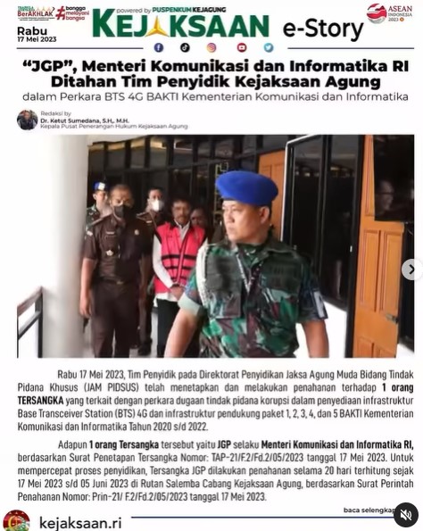 Uncategorized “JGP”, Menteri Komunikasi dan Informatioka RI Ditahan Tim Penyidik Kejaksaan Agung admin May 19, 2023 1 min read Lihat postingan ini di Instagram Sebuah kiriman dibagikan oleh Kejaksaan Negeri Blora (@kejariblora) Continue Reading Previous Previous post: Jaksa Agung Akan Menindak Tegas Oknum Jaksa Yang Menyalahgunakan Kewenangannya Sebagai JaksaNext Next post: Konferensi Pers Penahanan Tersangka “JGP” Dalam Perkara BTS 4G BAKTI Kominfo Leave a Reply Cancel replyYour email address will not be published. Required fields are marked *Comment * Name * Email * Website Save my name, email, and website in this browser for the next time I comment. Related News Upacara Peringatan Hari Otonomi Daerah ke-30 Tahun 2026 Tingkat Kabupaten Blora dengan tema “Dengan Otonomi Daerah Kita Wujudkan Asta Cita.” Upacara Peringatan Hari Otonomi Daerah ke-30 Tahun 2026 Tingkat Kabupaten Blora dengan tema “Dengan Otonomi Daerah Kita Wujudkan Asta Cita.” April 27, 2026 Apel Pagi di Kejaksaan Negeri Blora yang dipimpin Kepala Sub Bagian Pembinaan selaku Penerima Apel Apel Pagi di Kejaksaan Negeri Blora yang dipimpin Kepala Sub Bagian Pembinaan selaku Penerima Apel April 27, 2026