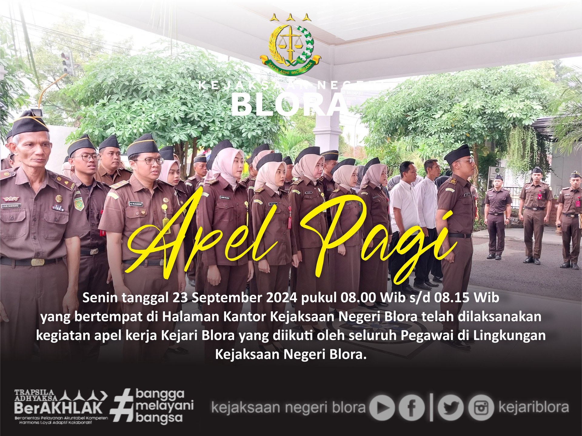 Pada hari Senin tanggal 23 September 2024 pukul 08.00 s.d 08.15 Wib yang bertempat di Halaman Kantor Kejaksaan Negeri Blora telah dilaksanakan kegiatan apel kerja Kejari Blora yang diikuti oleh seluruh Pegawai dan Pegawai PPNPN di Lingkungan Kejaksaan Negeri Blora.