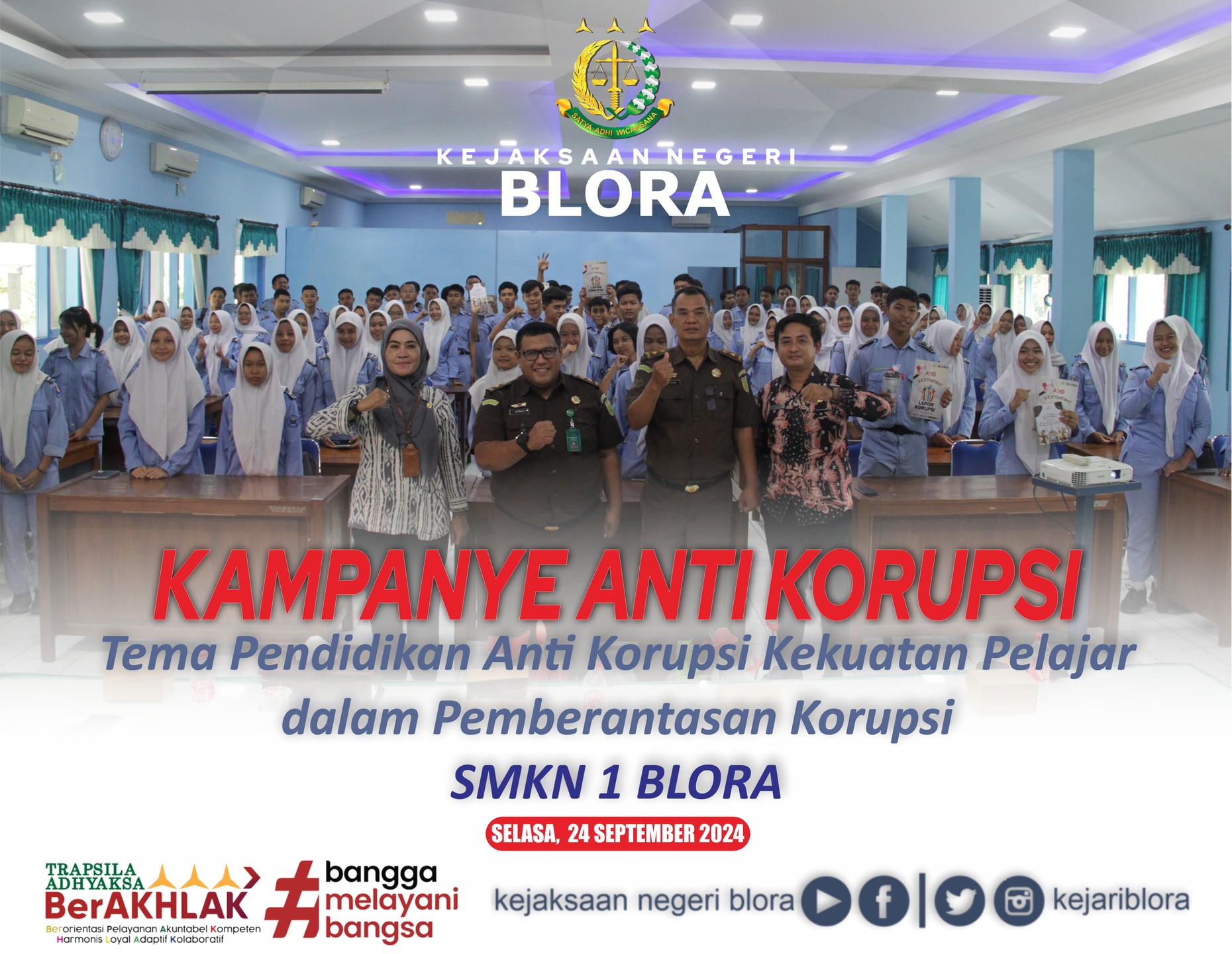 Uncategorized Kampanye Anti Korupsi dengan Tema Pendidikan Anti Korupsi Kekuatan Pelajar dalam Pemberantasan Korupsi di SMK N 1 Blora oleh Kejaksaan Negeri Blora admin September 24, 2024 1 min read Lihat postingan ini di Instagram Sebuah kiriman dibagikan oleh Kejaksaan Negeri Blora (@kejariblora) Continue Reading Previous Previous post: Kampanye Anti Korupsi dengan Tema Pendidikan Anti Korupsi Kekuatan Pelajar dalam Pemberantasan Korupsi di SMA N 1 Blora oleh Kejaksaan Negeri BloraNext Next post: Penyerahan Tanggung Jawab Tersangka dan Barang Bukti (Tahap II) dari Jaksa Penyidik Kejaksaan Tinggi Jawa Tengah Kepada Jaksa Penuntut Umum Kejaksaan Negeri Blora dalam perkara Tindak Pidana Korupsi Penyimpangan Penyertaan Modal Yayasan Kesejahteraan Angkasa Pura I (YAKKAP I) Pada PT Mitrasindo Sarana Mulia (PT. MSM) Tahun 2015 An Tersangka Drs. Purwanto Bin Darman dan Drs. Kintoron M.M Leave a Reply Cancel replyYour email address will not be published. Required fields are marked *Comment * Name * Email * Website Save my name, email, and website in this browser for the next time I comment. Related News Penerangan Hukum kepada Kelompok Kerja Madrasah Aliyah dan Madrasah Tsanawiyah pada Kemenag Kab. Blora Penerangan Hukum kepada Kelompok Kerja Madrasah Aliyah dan Madrasah Tsanawiyah pada Kemenag Kab. Blora April 23, 2026 Kegiatan Roadshow Wakil Menteri Kesehatan terkait Active Case Finding (ACF) Tuberkulosis (TB) serta kegiatan Tracing TB yang terintegrasi dengan Cek Kesehatan Gratis (CKG) Kegiatan Roadshow Wakil Menteri Kesehatan terkait Active Case Finding (ACF) Tuberkulosis (TB) serta kegiatan Tracing TB yang terintegrasi dengan Cek Kesehatan Gratis (CKG) April 23, 2026