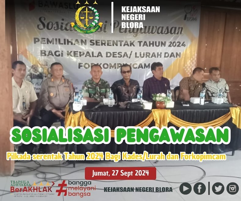 Uncategorized Sosialisasi pengawasan bagi Kepala Desa / Lurah & Forkompincam pada Pemilihan Serentak Tahun 2024 di Dapil 1 s/d 5 Wilayah Kabupaten Blora admin September 27, 2024 1 min read Lihat postingan ini di Instagram Sebuah kiriman dibagikan oleh Kejaksaan Negeri Blora (@kejariblora) Continue Reading Previous Previous post: Senam Pagi yang di ikuti Seluruh Pegawai pada Kejaksaan Negeri BloraNext Next post: Senam Pagi yang di ikuti Seluruh Pegawai pada Kejaksaan Negeri Blora Leave a Reply Cancel replyYour email address will not be published. Required fields are marked *Comment * Name * Email * Website Save my name, email, and website in this browser for the next time I comment. Related News Penerangan Hukum kepada Kelompok Kerja Madrasah Aliyah dan Madrasah Tsanawiyah pada Kemenag Kab. Blora Penerangan Hukum kepada Kelompok Kerja Madrasah Aliyah dan Madrasah Tsanawiyah pada Kemenag Kab. Blora April 23, 2026 Kegiatan Roadshow Wakil Menteri Kesehatan terkait Active Case Finding (ACF) Tuberkulosis (TB) serta kegiatan Tracing TB yang terintegrasi dengan Cek Kesehatan Gratis (CKG) Kegiatan Roadshow Wakil Menteri Kesehatan terkait Active Case Finding (ACF) Tuberkulosis (TB) serta kegiatan Tracing TB yang terintegrasi dengan Cek Kesehatan Gratis (CKG) April 23, 2026