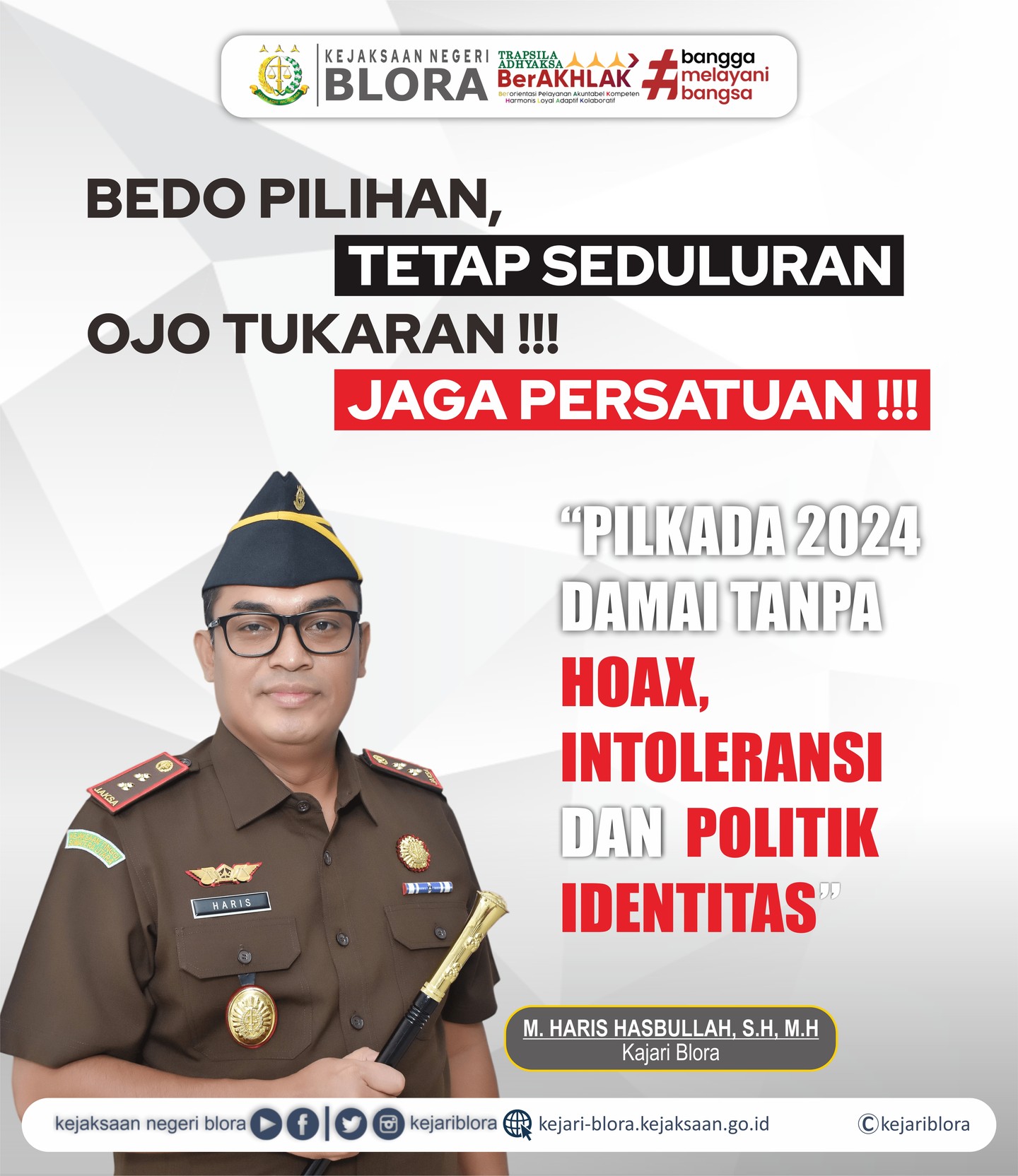 Uncategorized Himbauan Pilkada 2024 admin October 1, 2024 1 min read Lihat postingan ini di Instagram Sebuah kiriman dibagikan oleh Kejaksaan Negeri Blora (@kejariblora) Continue Reading Previous Previous post: Pada hari Selasa tanggal 01 Oktober 2024 pukul 08.00 s/d 08.15 Wib bertempat di Halaman Kantor Kejaksaan Negeri Blora yang beralamatkan di Jl. Ahmad Yani No. 22 Blora telah dilaksanakan Upacara Peringatan Hari Kesaktian Pancasila tahun 2024 yang di ikuti oleh seluruh pegawai di lingkungan Kejaksaan Negeri BloraNext Next post: Survei Kepuasan Masyarakat Kejaksaan Negeri Blora Leave a Reply Cancel replyYour email address will not be published. Required fields are marked *Comment * Name * Email * Website Save my name, email, and website in this browser for the next time I comment. Related News Upacara Peringatan Hari Otonomi Daerah ke-30 Tahun 2026 Tingkat Kabupaten Blora dengan tema “Dengan Otonomi Daerah Kita Wujudkan Asta Cita.” Upacara Peringatan Hari Otonomi Daerah ke-30 Tahun 2026 Tingkat Kabupaten Blora dengan tema “Dengan Otonomi Daerah Kita Wujudkan Asta Cita.” April 27, 2026 Apel Pagi di Kejaksaan Negeri Blora yang dipimpin Kepala Sub Bagian Pembinaan selaku Penerima Apel Apel Pagi di Kejaksaan Negeri Blora yang dipimpin Kepala Sub Bagian Pembinaan selaku Penerima Apel April 27, 2026