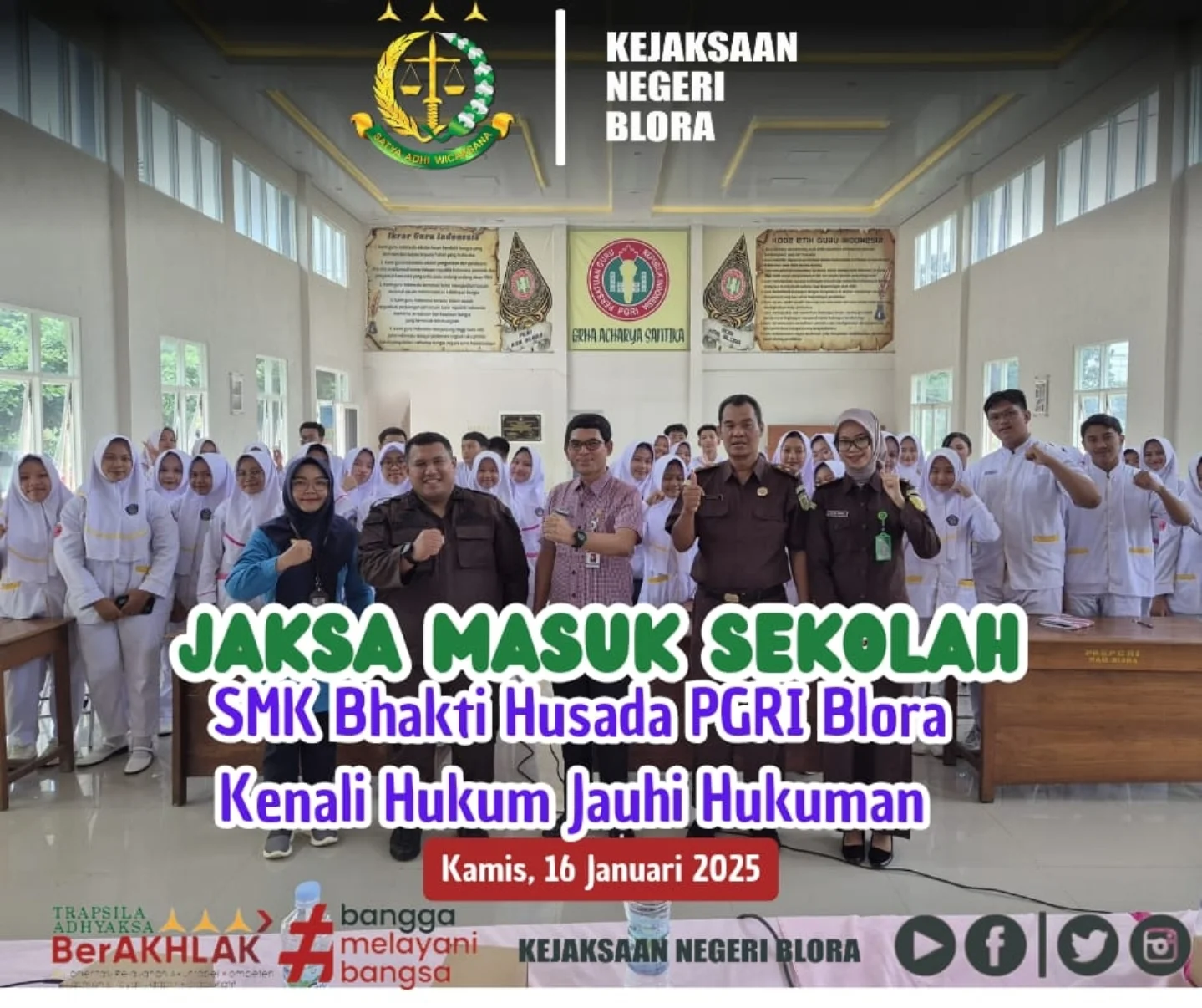 Uncategorized Penyuluhan Hukum JaksaMasuk Sekolah (JMS) di SMK Bhakti Husada PGRI BloraJI. Gatot Subroto Km.2 Blora admin January 16, 2025 1 min read Lihat postingan ini di Instagram Sebuah kiriman dibagikan oleh Kejaksaan Negeri Blora (@kejariblora) Continue Reading Previous Previous post: Kegiatan Penyuluhan Hukum JaksaMasuk Sekolah (JMS) di SMK Bhakti Husada PGRI BloraJI. Gatot Subroto Km.2 BloraNext Next post: Laporan Akuntablitas Kinerja Kejaksaan Negeri Blora Tahun 2024 Leave a Reply Cancel replyYour email address will not be published. Required fields are marked *Comment * Name * Email * Website Save my name, email, and website in this browser for the next time I comment. Related News Penerangan Hukum kepada Kelompok Kerja Madrasah Aliyah dan Madrasah Tsanawiyah pada Kemenag Kab. Blora Penerangan Hukum kepada Kelompok Kerja Madrasah Aliyah dan Madrasah Tsanawiyah pada Kemenag Kab. Blora April 23, 2026 Kegiatan Roadshow Wakil Menteri Kesehatan terkait Active Case Finding (ACF) Tuberkulosis (TB) serta kegiatan Tracing TB yang terintegrasi dengan Cek Kesehatan Gratis (CKG) Kegiatan Roadshow Wakil Menteri Kesehatan terkait Active Case Finding (ACF) Tuberkulosis (TB) serta kegiatan Tracing TB yang terintegrasi dengan Cek Kesehatan Gratis (CKG) April 23, 2026