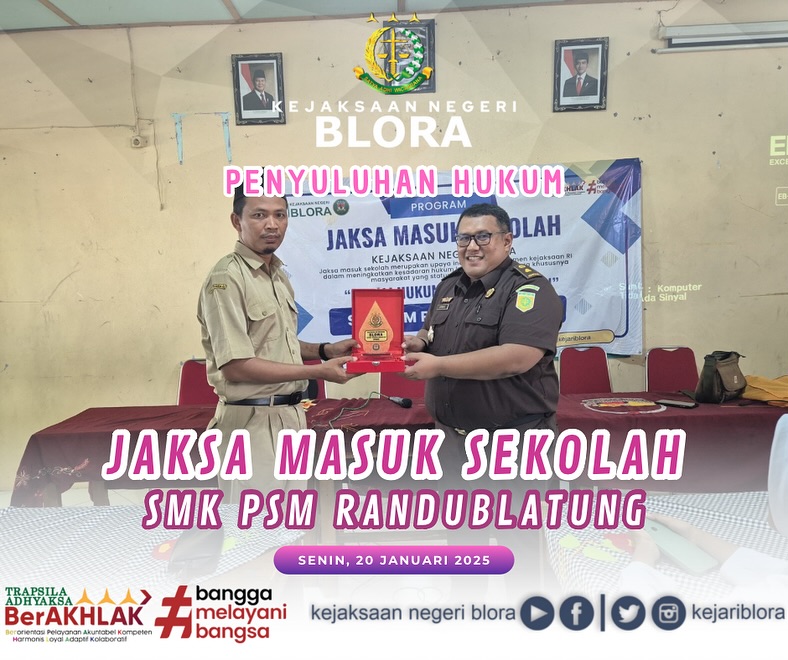 Uncategorized Jaksa Masuk Sekolah (JMS) Kejaksaan Negeri Blora di SMK PSM Randublatung Kabupaten Blora admin January 20, 2025 1 min read Lihat postingan ini di Instagram Sebuah kiriman dibagikan oleh Kejaksaan Negeri Blora (@kejariblora) Continue Reading Previous Previous post: Jaksa Masuk Sekolah (JMS) Kejaksaan Negeri Blora di SMK PSM Randublatung Kabupaten BloraNext Next post: Penyuluhan Hukum Jaksa Masuk Sekolah (JMS) di SMK NU Kedungtuban Leave a Reply Cancel replyYour email address will not be published. Required fields are marked *Comment * Name * Email * Website Save my name, email, and website in this browser for the next time I comment. Related News Penerangan Hukum kepada Kelompok Kerja Madrasah Aliyah dan Madrasah Tsanawiyah pada Kemenag Kab. Blora Penerangan Hukum kepada Kelompok Kerja Madrasah Aliyah dan Madrasah Tsanawiyah pada Kemenag Kab. Blora April 23, 2026 Kegiatan Roadshow Wakil Menteri Kesehatan terkait Active Case Finding (ACF) Tuberkulosis (TB) serta kegiatan Tracing TB yang terintegrasi dengan Cek Kesehatan Gratis (CKG) Kegiatan Roadshow Wakil Menteri Kesehatan terkait Active Case Finding (ACF) Tuberkulosis (TB) serta kegiatan Tracing TB yang terintegrasi dengan Cek Kesehatan Gratis (CKG) April 23, 2026