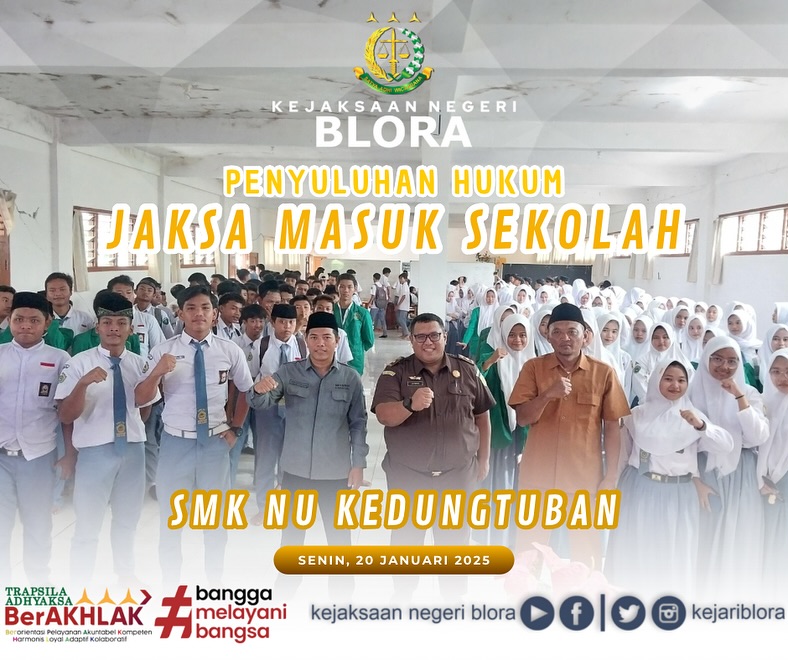 Uncategorized Penyuluhan Hukum Jaksa Masuk Sekolah (JMS) di SMK NU Kedungtuban admin January 21, 2025 1 min read Lihat postingan ini di Instagram Sebuah kiriman dibagikan oleh Kejaksaan Negeri Blora (@kejariblora) Continue Reading Previous Previous post: Jaksa Masuk Sekolah (JMS) Kejaksaan Negeri Blora di SMK PSM Randublatung Kabupaten BloraNext Next post: Penyuluhan Hukum Jaksa Masuk Sekolah (JMS) di SMK NU Kedungtuban Leave a Reply Cancel replyYour email address will not be published. Required fields are marked *Comment * Name * Email * Website Save my name, email, and website in this browser for the next time I comment. Related News Penerangan Hukum kepada Kelompok Kerja Madrasah Aliyah dan Madrasah Tsanawiyah pada Kemenag Kab. Blora Penerangan Hukum kepada Kelompok Kerja Madrasah Aliyah dan Madrasah Tsanawiyah pada Kemenag Kab. Blora April 23, 2026 Kegiatan Roadshow Wakil Menteri Kesehatan terkait Active Case Finding (ACF) Tuberkulosis (TB) serta kegiatan Tracing TB yang terintegrasi dengan Cek Kesehatan Gratis (CKG) Kegiatan Roadshow Wakil Menteri Kesehatan terkait Active Case Finding (ACF) Tuberkulosis (TB) serta kegiatan Tracing TB yang terintegrasi dengan Cek Kesehatan Gratis (CKG) April 23, 2026