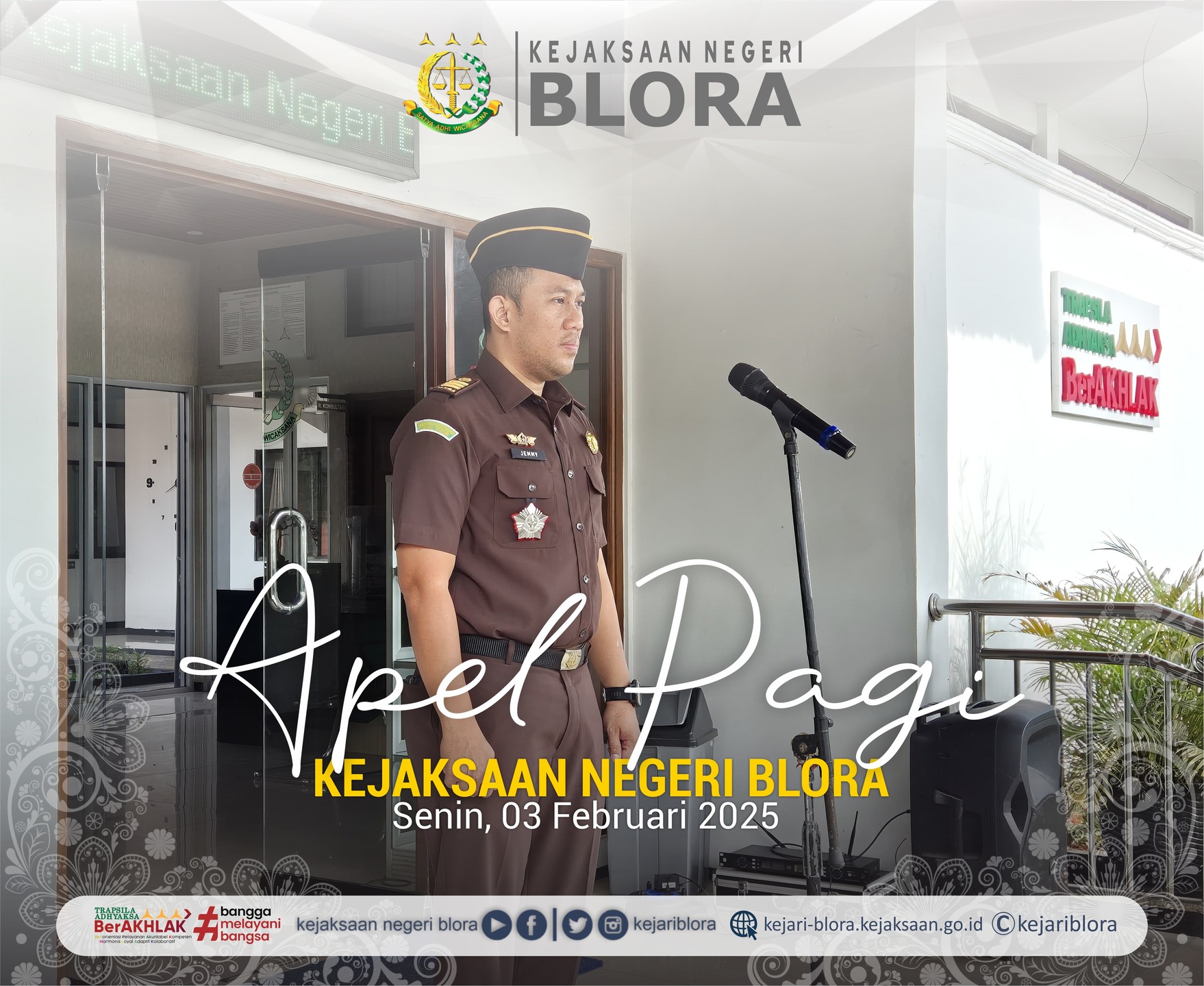 Uncategorized Apel Pagi, Senin 03 Februari 2025 admin February 3, 2025 1 min read Lihat postingan ini di Instagram Sebuah kiriman dibagikan oleh Kejaksaan Negeri Blora (@kejariblora) Continue Reading Previous Previous post: Kejaksaan Agung Penegak Hukum Paling Dipercayai PublikNext Next post: Ikutilah Talkshow Jaksa Menyapa dengan Tema “Jaksa Jaga Desa Menuju Penegakan Hukum Yang Humanis” bersama Kasi Intelijen dan Jaksa Fungsional Kejari Blora live di radio Gagak Rimang frekuensi FM 105.9 MHz, Senin, 10 Februari 2025 pukul 08.30 WIB Leave a Reply Cancel replyYour email address will not be published. Required fields are marked *Comment * Name * Email * Website Save my name, email, and website in this browser for the next time I comment. Related News Penerangan Hukum kepada Kelompok Kerja Madrasah Aliyah dan Madrasah Tsanawiyah pada Kemenag Kab. Blora Penerangan Hukum kepada Kelompok Kerja Madrasah Aliyah dan Madrasah Tsanawiyah pada Kemenag Kab. Blora April 23, 2026 Kegiatan Roadshow Wakil Menteri Kesehatan terkait Active Case Finding (ACF) Tuberkulosis (TB) serta kegiatan Tracing TB yang terintegrasi dengan Cek Kesehatan Gratis (CKG) Kegiatan Roadshow Wakil Menteri Kesehatan terkait Active Case Finding (ACF) Tuberkulosis (TB) serta kegiatan Tracing TB yang terintegrasi dengan Cek Kesehatan Gratis (CKG) April 23, 2026