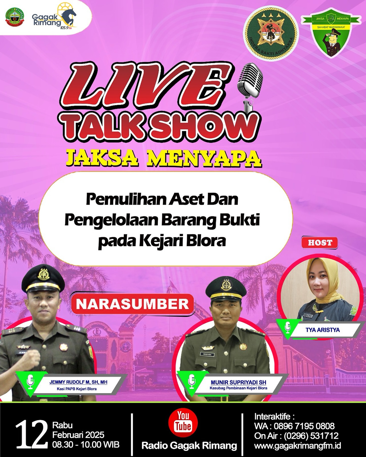 Ikutilah Talkshow Jaksa Menyapa dengan Tema “Pemulihan Aset Dan Pengelolaan Barang Bukti pada Kejari Blora” bersama Kasi PAPB dan Kasubag Pembinaan Kejari Blora live di radio Gagak Rimang frekuensi FM 105.9 MHz, Rabu, 12 Februari 2025 pukul 08.30 WIB