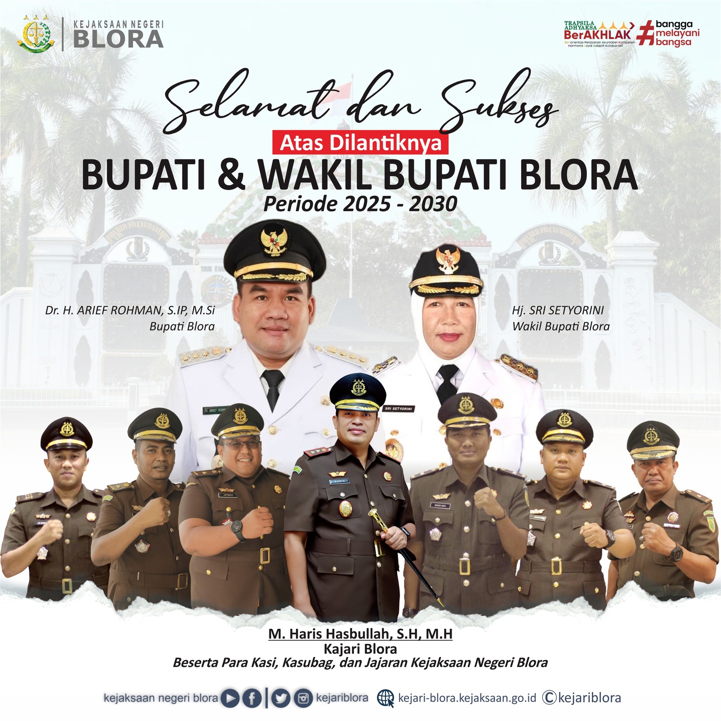 - Kepala Kejaksaan Negeri Blora Beserta Para Kasi, Kasubag dan Jajaran, Mengucapkan Selamat dan Sukses atas dilantiknya Bupati Blora ( Dr. H. Arief Rohman, S.IP, M.Si ) dan Wakil Bupati Blora ( Hj. Sri Setyorini ) Periode 2025 – 2030 oleh Presiden RI Bpk. Prabowo Subianto di Istana Merdeka