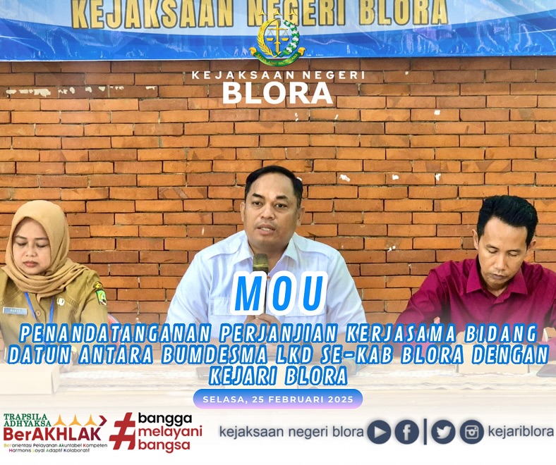 Uncategorized Penandatanganan Perjanjian Kerjasama Bidang Perdata dan Tata Usaha Negara Antara BUMDESMA LKD Se Kabupaten Blora dengan Kejaksaan Negeri Blora admin February 25, 2025 1 min read Lihat postingan ini di Instagram Sebuah kiriman dibagikan oleh Kejaksaan Negeri Blora (@kejariblora) Continue Reading Previous Previous post: Apel Pagi, Senin 24 Februari 2025Next Next post: Kunjungan Lapangan. Kasubdit PPI Pengairan, Pertanian dan Kelautan pada Direktorat PPS Jamintel ( Edy Winarko, S.H., М.Н ) bersama Tim PPS Kejagung dalam rangka Monitoring dan EvaluasiPelaksanaan Pekerjaan Proyek Strategis Nasional Pembangunan Bendungan Karangnongko di Lokasi Pembangunan Bendungan Karangnongko Paket II Leave a Reply Cancel replyYour email address will not be published. Required fields are marked *Comment * Name * Email * Website Save my name, email, and website in this browser for the next time I comment. Related News Penerangan Hukum kepada Kelompok Kerja Madrasah Aliyah dan Madrasah Tsanawiyah pada Kemenag Kab. Blora Penerangan Hukum kepada Kelompok Kerja Madrasah Aliyah dan Madrasah Tsanawiyah pada Kemenag Kab. Blora April 23, 2026 Kegiatan Roadshow Wakil Menteri Kesehatan terkait Active Case Finding (ACF) Tuberkulosis (TB) serta kegiatan Tracing TB yang terintegrasi dengan Cek Kesehatan Gratis (CKG) Kegiatan Roadshow Wakil Menteri Kesehatan terkait Active Case Finding (ACF) Tuberkulosis (TB) serta kegiatan Tracing TB yang terintegrasi dengan Cek Kesehatan Gratis (CKG) April 23, 2026